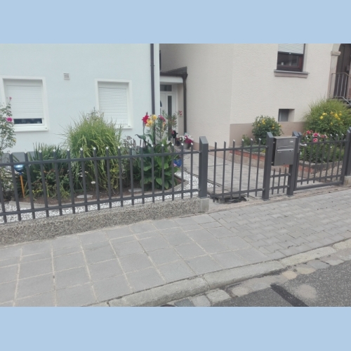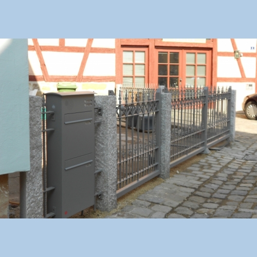 Zaun Tor 200 - 2 hochgeladen: 18 Dec 2016 Schiedeeisenzaun mit Spitzen zwischen Granitsäulen pulverbeschichteter Renz Briefkasten große Front mit Klingel und Gegensprechanlage